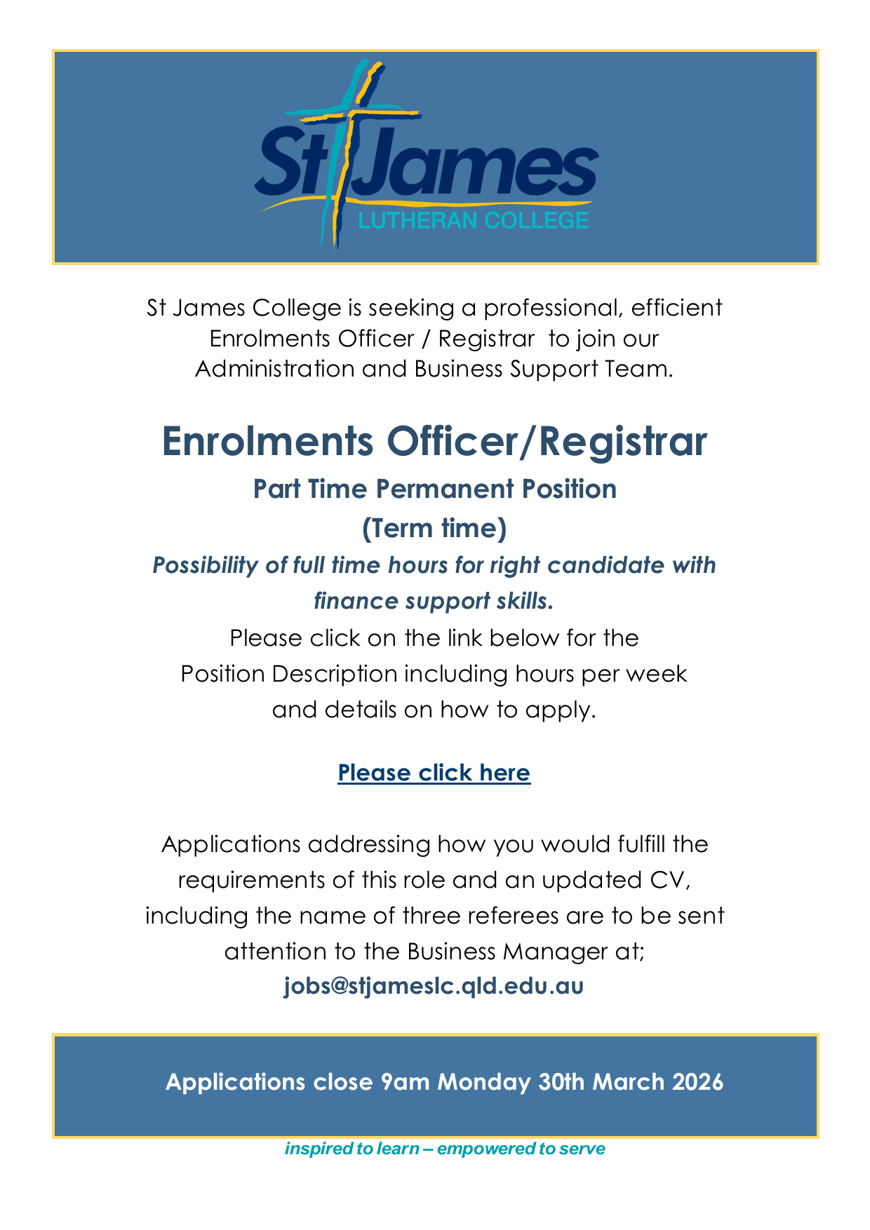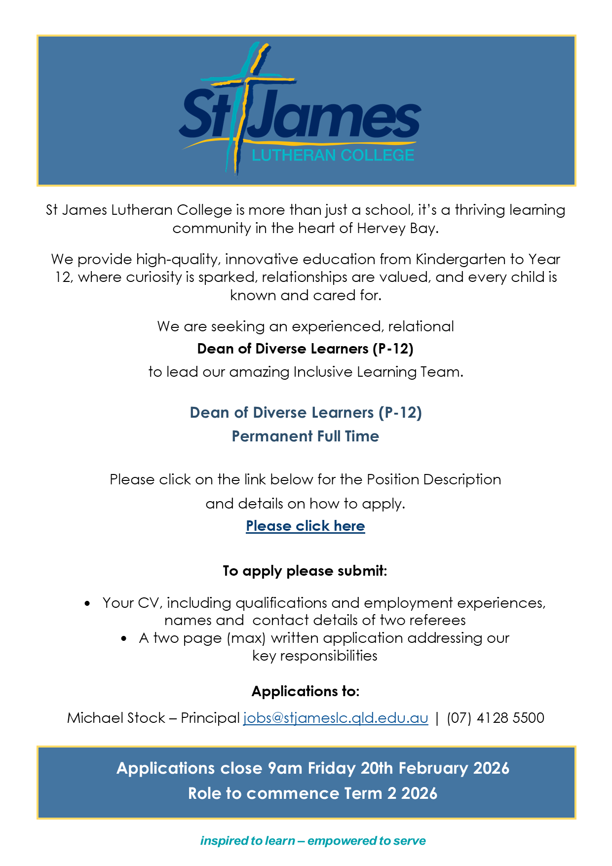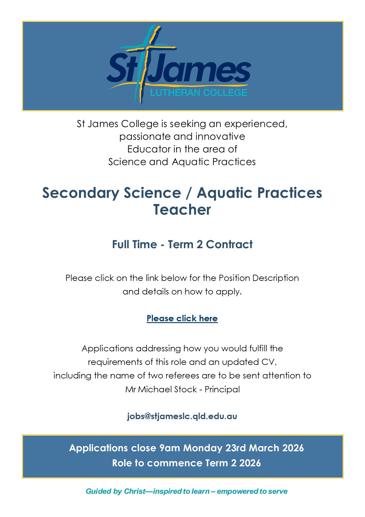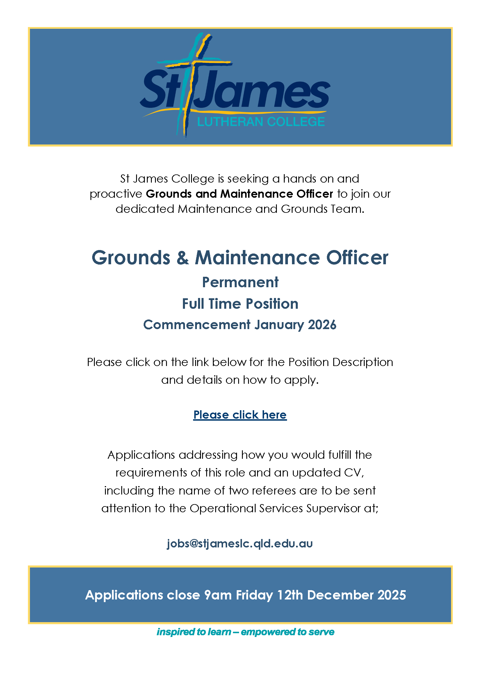 St James Lutheran College offers employment opportunities to people with a variety of skills and expertise and who demonstrate the determination and enthusiasm to make our collaborative learning environment a success.